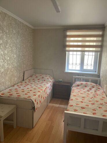 В комнате расположены три односпальные кровати с белыми деревянными рамами. Каждая кровать застелена покрывалом с цветочным узором и подушкой. На полу лежит большой ковер с традиционным орнаментом в бежевых и коричневых тонах. Комната оборудована кондиционером и радиатором отопления. Окна закрыты жалюзи, частично открыто одно окно.