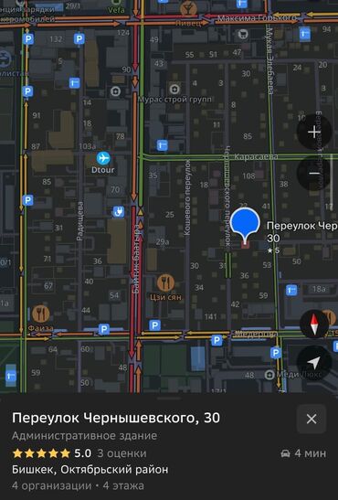 Офисное помещение 130 м² — Бишкек, Октябрьский район, переулок Чернышевского, 30 - Формат: административное здание, 4 этажа, в локации отмечены 4 организации (по данным карты). - Планировка: неско...