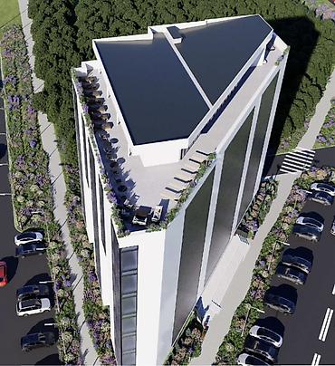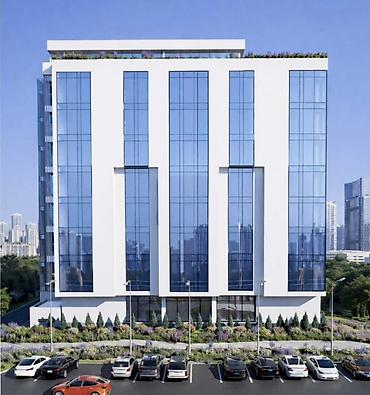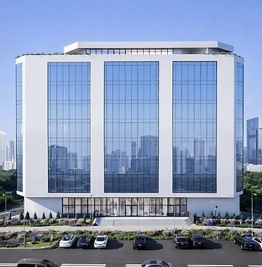 - Современное 8-этажное здание с панорамным остеклением и строгой архитектурой.