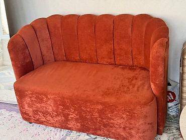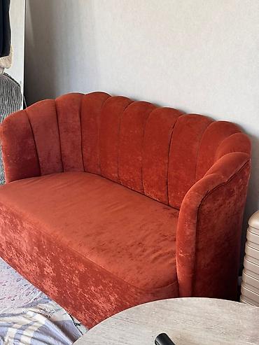 Красный диван с мягкой обивкой. Имеет раскладной механизм, что позволяет использовать его в качестве спального места. Продаем все по отдельности. Три дивана и кресло.