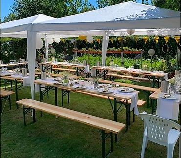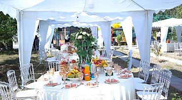 Аренда шатров, баннера, оформление сада, столы и стулья