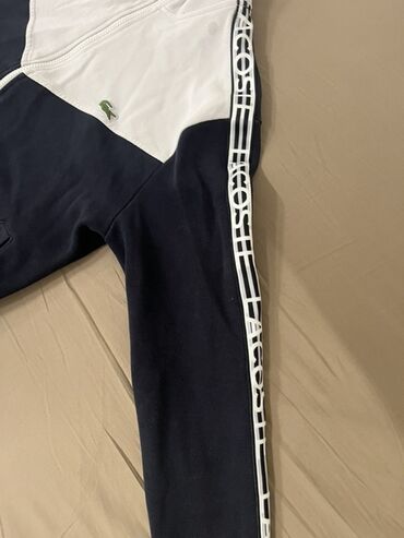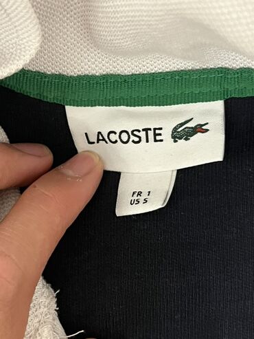 - Полосы‑лампасы по рукавам с крупным логотипом LACOSTE.