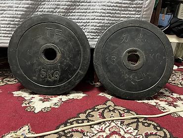 - Блины с хватами: диски по 10 кг (диаметр отверстия 50 мм, под олимпийский гриф). На фото установлены также дополнительные диски того же стандарта.