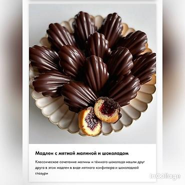 - Мадлен с мятной малиной и шоколадом: малиновый мятный конфитюр внутри, тёмная шоколадная глазурь с классическим сочетанием вкусов.