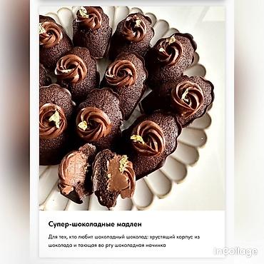 - Супер‑шоколадные мадлен: хрустящий шоколадный корпус и тающая шоколадная начинка.