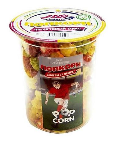 Попкорн «Фруктовый микс» — готовая сладкая закуска в яркой карамельной глазури. Разноцветные зерна кукурузы с фруктовыми вкусами: клубника/вишня (красный), яблоко/киви (зеленый), ананас/манго (желтый) и др. Хрустящий, ароматный, не требует приготовления.