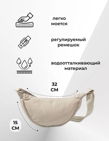 Ремень кросс боди несъемный, широкий, регулируемый, это дает возможность носить ее как тканевый нагрудный кошелек или как полукруглую сумочку багет, а также как поясную барсетку. Влагоотталкивающая непромокаемая ткань.