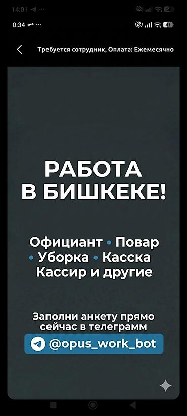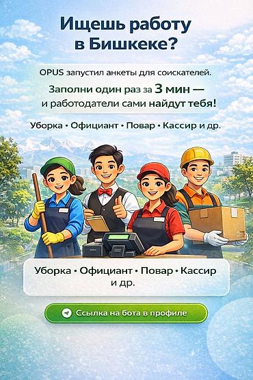 Бул жерде Бишкекте убактылуу же туруктуу иш таба аласың — официант, тазалоо, кассир, ашпозчу жана башкалар. Иш берүүчүлөр анкета аркылуу өздөрү табат.