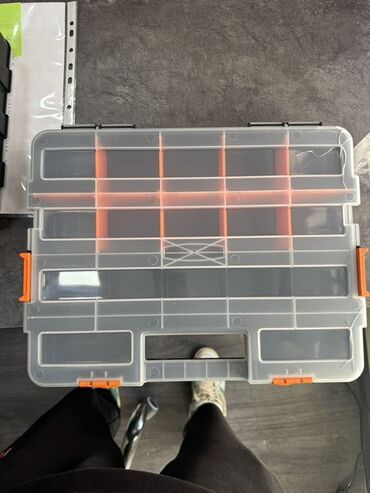 - Внутри набор съемных перегородок: можно настраивать количество и размер ячеек под крепёж, биты, саморезы, дюбели, фурнитуру, рыболовные принадлежности и т.п.