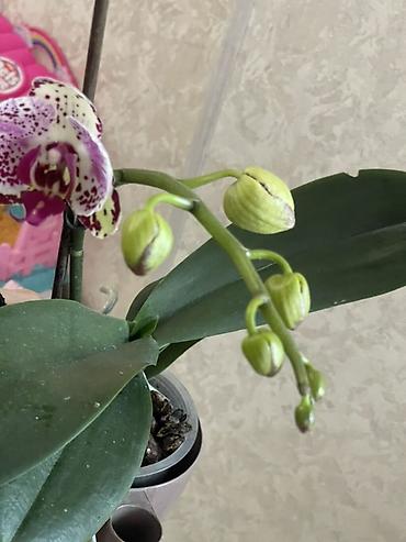 Комнатные орхидеи (скорее всего цимбидиум) в декоративной упаковке. - Высокие кусты с плотными зелёными листьями и множеством соцветий кремово‑белого оттенка с розовыми акцентами. - Каждое растени...