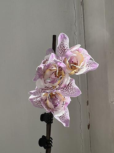 - Окраска: крупные бело‑кремовые цветки с лилово‑розовыми лепестками и точечной крапчатой расцветкой; губа с тёплыми жёлто‑бордовыми акцентами.