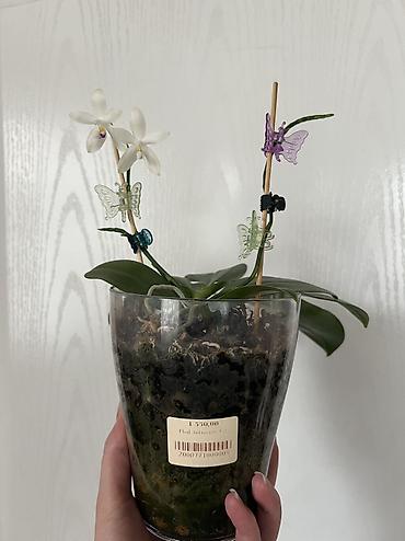 - Два цветоноса, зафиксированы декоративными клипсами-бабочками на бамбуковых опорах.