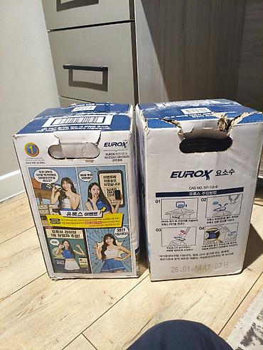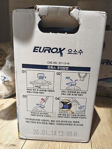 - Упаковка EUROX с ручкой; на коробке приведены пошаговые инструкции по заливке через шланг/носик.