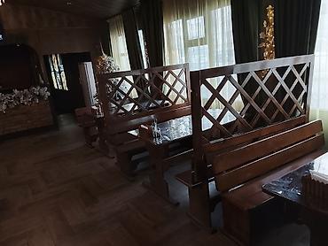 - Посадка на массивных деревянных лавках и столах, разделённых высокими деревянными перегородками-решётками — удобно для компаний и семей.