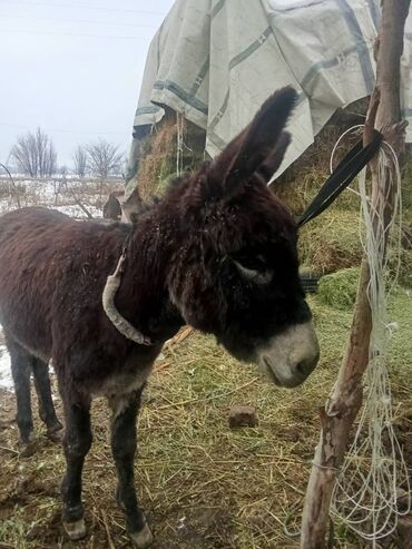 Осёл, домашний, темно-бурого окраса с светлой мордой. Компактного роста, крепкий корпус, прямые конечности, густая зимняя шерсть. На фото — на привязи у кормушки. Подходит для хозяйственных работ в частном подворье: упряжка под лёгкую тележку, вывоз сена/дров, караван по тропам. Неприхотлив в содержании, рацион — сено, солома, зерносмесь, корнеплоды; требует сухого укрытия и регулярной расчистки копыт. Спокойный характер, устойчив к холоду и сырости. Возможна совместная жизнь с крупным рогатым скотом и мелкими животными. Отличный рабочий помощник и компаньон для фермерского хозяйства.