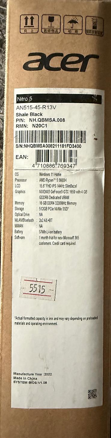 В комплекте — фирменная коробка Nitro 5. На корпусе — стильный чёрный дизайн с логотипом Acer, клавиатура с выделенными WASD. Отлично подходит для игр и задач, требующих производительности, а экран 144 Гц обеспечивает плавную картинку.