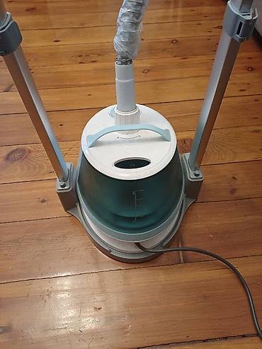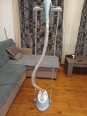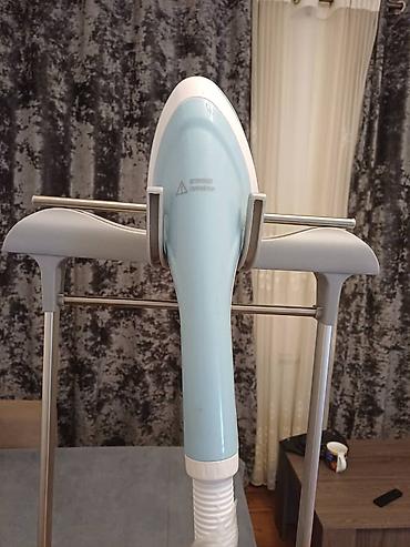 - Вертикальный напольный отпариватель с телескопическими стойками и держателем для плечиков.