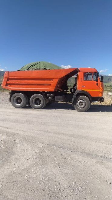 Самосвал КАМАЗ (оранжевый, 3-осный, 6x4) - Кузов самосвальный с высокими бортами, задняя разгрузка. - Трёхосная схема, двойные задние колёса для повышенной грузоподъёмности. - Металлический кузов ...