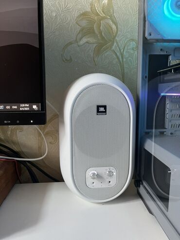 Белая акустическая система JBL с овальным корпусом, предназначенная для воспроизведения аудио. Фронтальная часть оснащена металлической решеткой, защищающей динамики. На передней панели расположены элементы управления: два поворотных регулятора и два разъема 3,5 мм, что обеспечивает удобство подключения и настройки. Компактный размер делает ее подходящей для размещения на столе или полке, а универсальный дизайн позволяет интегрировать ее в различные интерьеры.