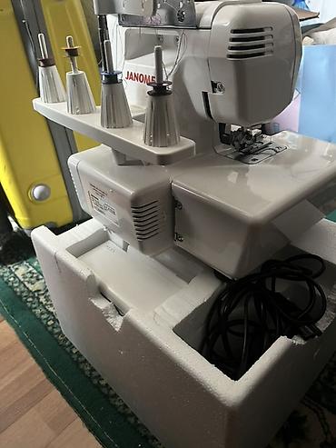 Подходит для обработки срезов, подгибки, создания декоративных швов и пошива трикотажной одежды. На фото видны комплектующие: держатель катушек, кабель питания.