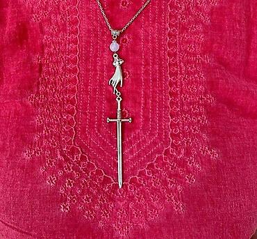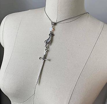 Ожерелье О эффектное серебристое колье с оригинальным кулоном в виде руки, держащей меч — стильный акцент, который подчеркнёт индивидуальность и уверенность в себе.