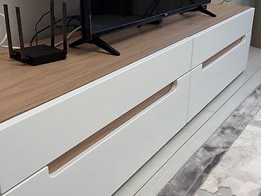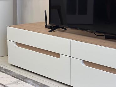 Тумба ТВ/медиатумба с двумя распашными шкафчиками и открытой секцией по центру. Особенности: - Форм‑фактор: низкая тумба на устойчивых черных ножках - Планировка: 2 закрытых отсека по краям + цент...