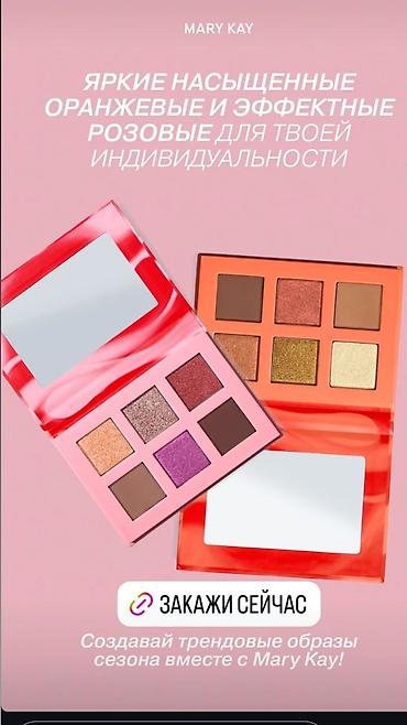 Палетка теней для век Mary Kay, представленная в двух цветовых вариантах: ярко-розовая палитра с шестью оттенками и оранжевая палитра с восемью оттенками. Обе палетки включают как матовые, так и блестящие текстуры, что позволяет создавать разнообразные образы. Компактный дизайн со встроенным зеркалом делает их удобными для использования в дороге. Оттенки варьируются от насыщенных оранжевых и золотистых до глубоких розовых и коричневых, предлагая универсальные комбинации для дневного и вечернего макияжа.