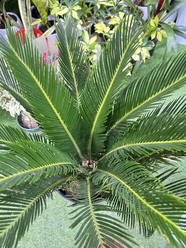 Саговник (Cycas revoluta) в горшке. - Компактный экземпляр с несколькими перистыми листьями, насыщенно‑зеленая крона. - Низкая потребность в поливе: любит яркий рассеянный свет, просушка верхнего ...