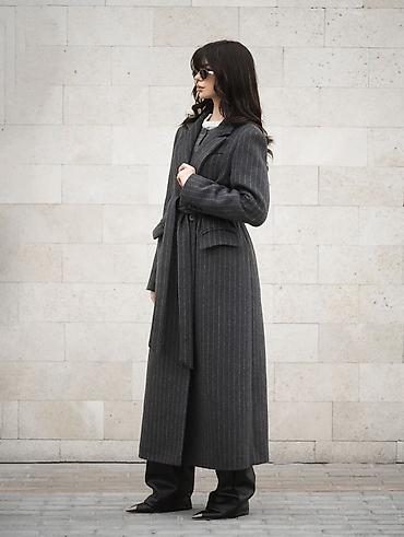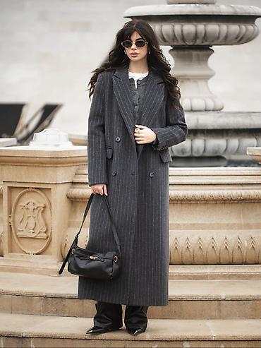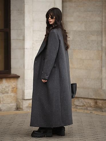 Пальто женское, классическое, прямого кроя. - Цвет: светло‑серый меланж. - Длина: ниже колена (макси). - Застёжка: два пуговицы спереди. - Воротник: широкие лацканы. - Рукава: длинные, свободные. -...