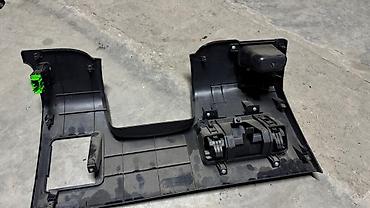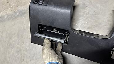 Панель центральной консоли черного цвета. Эта панель, вероятно, предназначена для установки в автомобиле и имеет отверстия для кнопок и небольшого отсека. Подходит для замены поврежденной или изношенной панели.