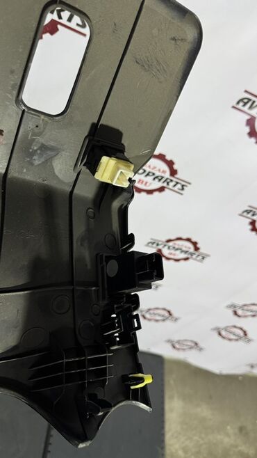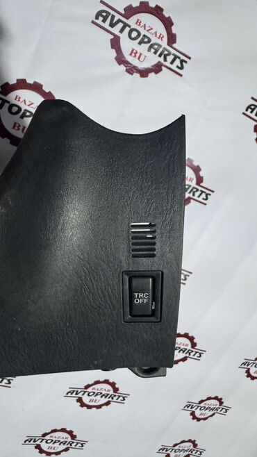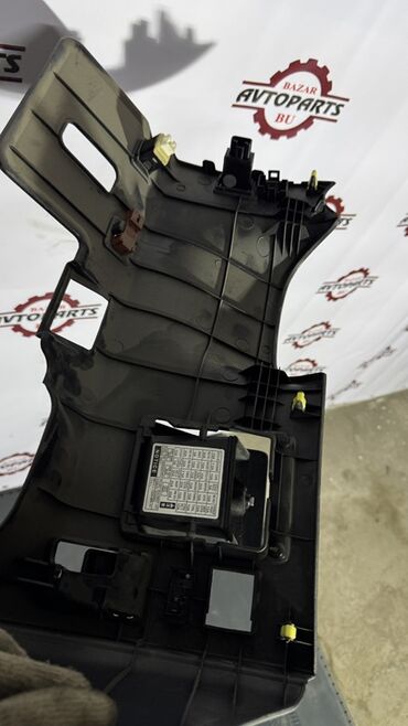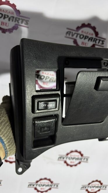 Черная пластиковая панель управления автомобиля. Содержит отсек с крышкой, кнопки управления и вентиляционные отверстия. Предназначена для установки в салоне автомобиля и обеспечивает удобный доступ к элементам управления.