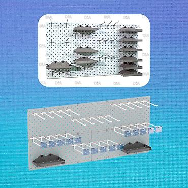 Перфорированные панели возможно установить на любое свободное место в различной компоновке (стена, колонна, торговое оборудование и т.д. )имеет большой ассортимент различных комплектующих, что расширяет область применения.