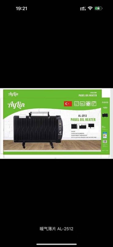 - AyLin AL‑2512 — панельный масляный обогреватель 3500 Вт: 2 нагревательных элемента, регулируемый термостат, комплектуется вешалкой для одежды и емкостью для увлажнения (water tank).