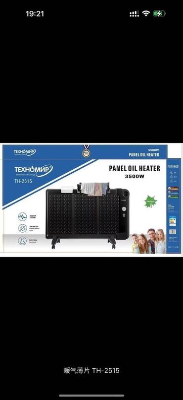 - ТЕХНОМИР TH‑2515 — панельный масляный обогреватель 3500 Вт. Тихая работа, без запаха. Есть штанга/держатель для сушки.