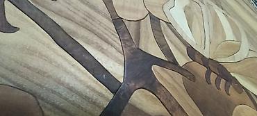 - Техника: набор из тонких шпонов, каждая деталь вырезана и подогнана вручную; естественные оттенки породы создают плавные переходы и объём.