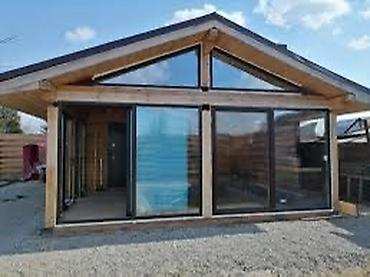 - Форматы: сплошные панорамные панели от пола до потолка, глухие и раздвижные створки, угловые решения без массивных стоек, треугольные и трапециевидные вставки под линию крыши.