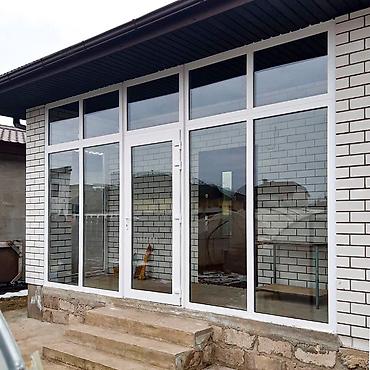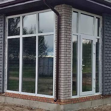 - Конструкция: витражные стационарные окна в полной высоте и входная дверь в едином ПВХ-портале.