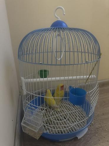 Пара декоративных попугаев (неразлучники) с клеткой и аксессуарами.