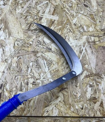 Пара ручных кос с синими пластиковыми рукоятками, предназначенных для обрезки травы, кустарников или сорняков. Каждая коса оснащена изогнутым металлическим лезвием, закрепленным на металлической основе с помощью заклепок, что обеспечивает надежность конструкции. Лезвия имеют заостренную форму для эффективной работы. Инструмент подходит для использования в саду, на даче или при выполнении сельскохозяйственных работ.