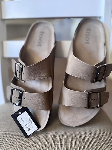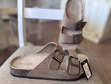 - Лаконичный дизайн в стиле Birkenstock, логотип toot на стельке.