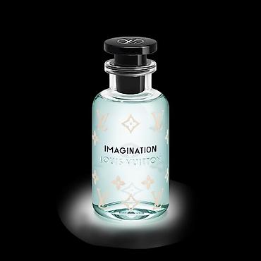 Louis Vuitton Imagination — ароматная вода (Eau de Parfum) во флаконе фирменной цилиндрической формы с магнитной черной крышкой и тиснением логотипа на стекле. Прозрачный аквамариновый цвет содержимого подчеркивает свежий характер композиции. На одной из версий флакона — бежевые монограммы LV и цветочные мотивы.