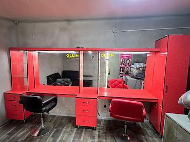 Подходит для салона красоты, барбершопа или визажного кабинета: есть освещенные зеркала, достаточное количество мест хранения и готовая зона ожидания. Цветовое решение — красный/черный, легко собирается в линию вдоль стены.