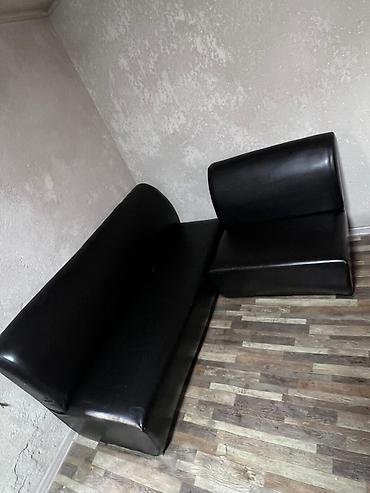 - Гостевая зона: черный диван‑уголок из кожзаменителя.