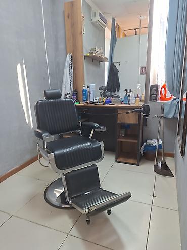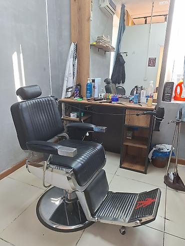 - Кресло барберское с гидравлическим подъемником, широким сиденьем и спинкой из черной рифленой экокожи, подлокотники с металлическими накладками, подножка-платформа.
