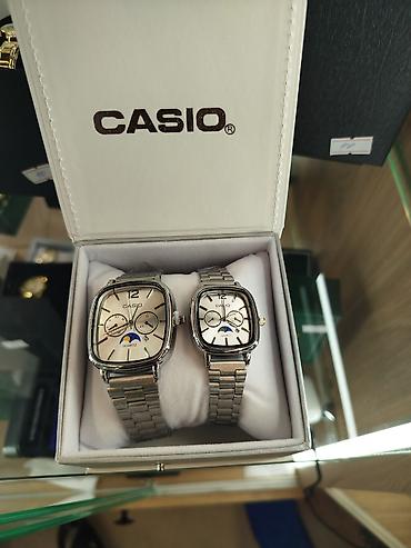 - Casio в серебристом тоне: стальные корпуса, светлые циферблаты с малыми субциферблатами и стилизованной «луной», кварцевый механизм, стальные браслеты. Парный комплект в коробке CASIO.