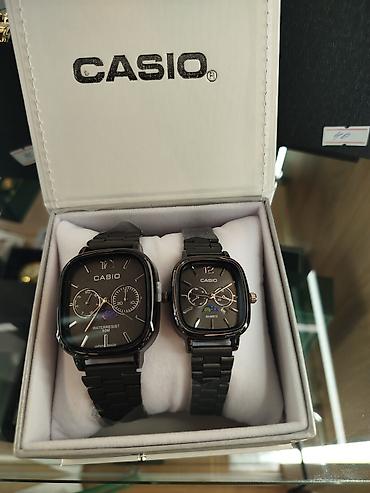 - Casio в чёрном тоне: прямоугольные корпуса, чёрные циферблаты, дополнительные малые циферблаты (индикация дня/даты и «фаза луны»-стилизация), надпись Water Resist 50M на мужской модели, кварцевый механизм. Стальные браслеты с чёрным покрытием. Парный набор в фирменной коробке.