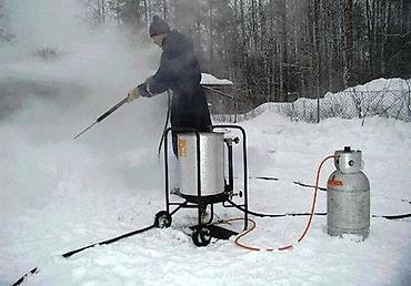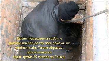 Парогенератор чаще всего применяется при разморозке коммуникаций изнутри. В трубу опускается шланг до момента его упора в ледяную пробку и подается горячий пар, в процессе оттаивания шланг продвигается глубже. Для пластиковых труб этот метод идеален, так как оказывает щадящее воздействие на коммуникации.
