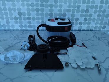 - Переносной пароочиститель с верхней панелью управления: регулятор подачи пара и кнопка включения/выключения.
