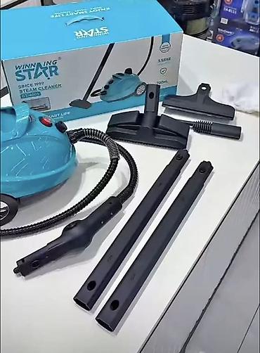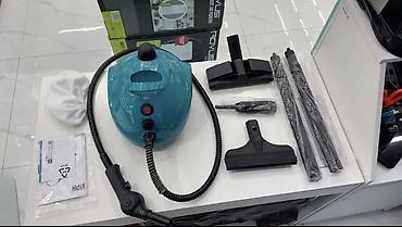Комплектация на фото: основной блок пароочистителя, шланг-рукоять, 2 удлинителя, напольная насадка, скребок для стекол, точечная насадка, тканевый колпачок, документация.