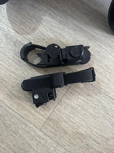 - Крепление: регулируемые зажимы/хомуты для установки на раму/ось коляски (на фото — комплект крепёжных адаптеров с фиксаторами).